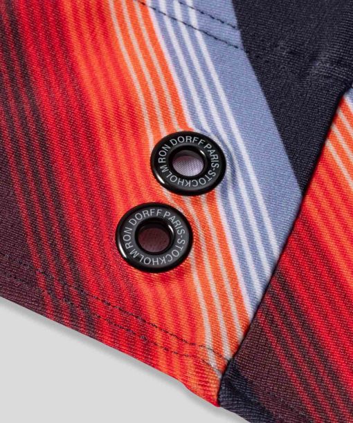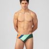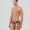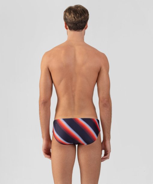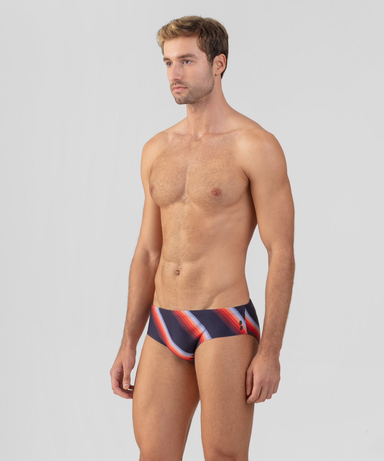 This model is inspired by the cult Brazilian water polo briefs of the early 80s, the swim briefs is revisited with diagonal stripes for a vintage look. Made in an extra-thick but quick-drying Italian-made polyamide for optimized silhouette and guaranteed fit swim after swim. Breathable micro-mesh lining. Elastic waistband with interior drawstring. Ideal for frequent pool use. Featuring the double black-lacquered RD signature eyelets.